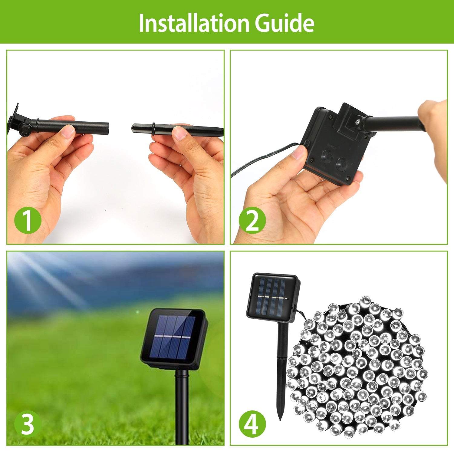 **【Cost-saving Solar Powered】*:Power supplied by solar energy,no extra electricity cost. Adopting high-grade polysilicon solar panel with 180°angle adjustable design and built-in 800mAh Ni-MH battery,after approx. 8-12hrs charging,our string light can work about 8hrs in steady-on mode and about 15hrs in flash mode.